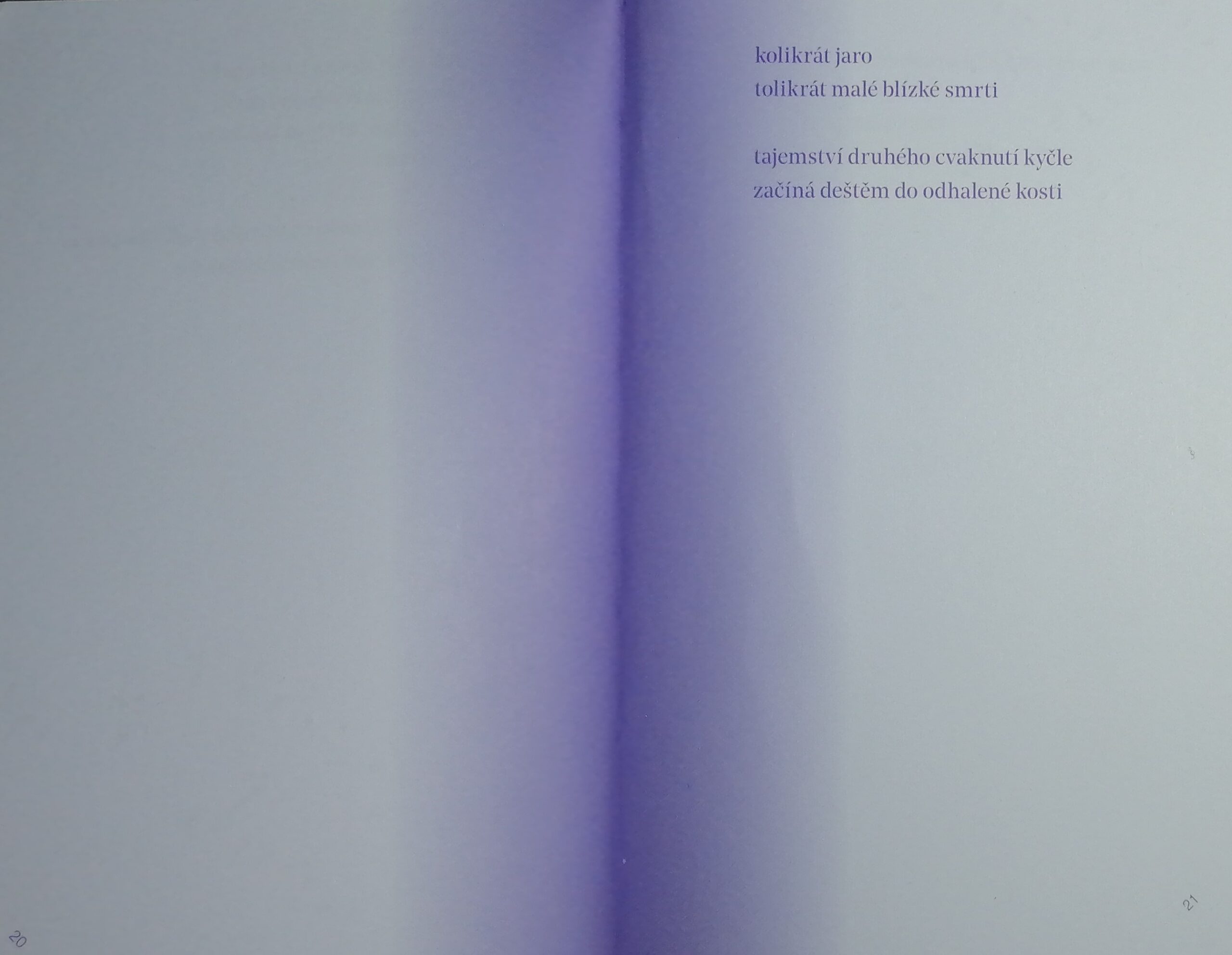 Pokud se tak rozhodneme, čtyřverší: „(lásko, prosím tě / jen se nedívej na nohy / vypadaly by totiž jako kola / a já opravdu nevím proč)“ (s. 23) nás dost možná ponechá lehce u vytržení. Narazíme-li na něj nicméně během tradičního levo-pravého čtení později, tak nás po řádcích typu: „v noci jsme si svítili telefony na cestu / pro lidi z okolí jsme vypadali jako auto“ (s. 14) nebo: „jednou jsem řekla, že chci řídit auto / aniž bych v něm seděla“ (s. 16) až tolik nezaskočí. Obdobné výzvy k reverznímu listování ke všemu nalezneme jak v závěru druhého cyklu [když si zapínám prohlížeč, dlouho se nic neděje]: „po chvíli nám ani nepřijde divné / že mluvíme pozpátku všichni“ (s. 39), tak v samotném eponymním názvu třetího celku.