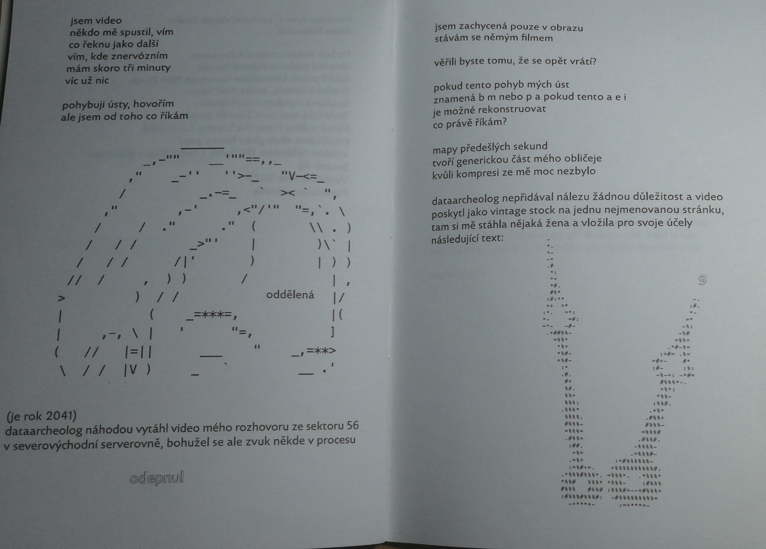 Pomyslnou styčnou plochou celé sbírky je finální nepojmenovaná báseň ukrytá za samotnou tiráží knihy. Pecenová si v ní představuje okamžik, kdy dataarcheolog v roce 2041 objeví její dezintegrované video bez zvukové stopy a nahraje jej na internet, odkud si jej někdo stáhne a vloží „následující text:“ (s. 51), kdy po dvojtečce následuje ilustrace hodinových ručiček. Ty sice na první pohled ukazují jednu hodinu, ale na místě, kde by se na klasickém ciferníku nacházela jednička, vidíme devítku. Autorka tímto způsobem opět cyklicky odkazuje hned na dvě části z prvního cyklu, a to na třináctou ve smyslu třinácti hodin: „hodiny bez ručiček by kdysi vypadaly směšně“ (s. 11), a na devátou: „ta žena, která vypadá jako já // […] vytváří tah, kterým se stávám divákem videa“ (s. 15).